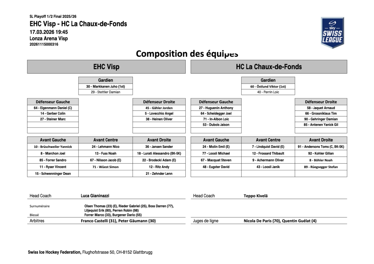Lonza Arena, Visp – Spect.: 3’373 – Arb.: Castelli, Gäumann, De Paris, Guélat – SOG: 25-26