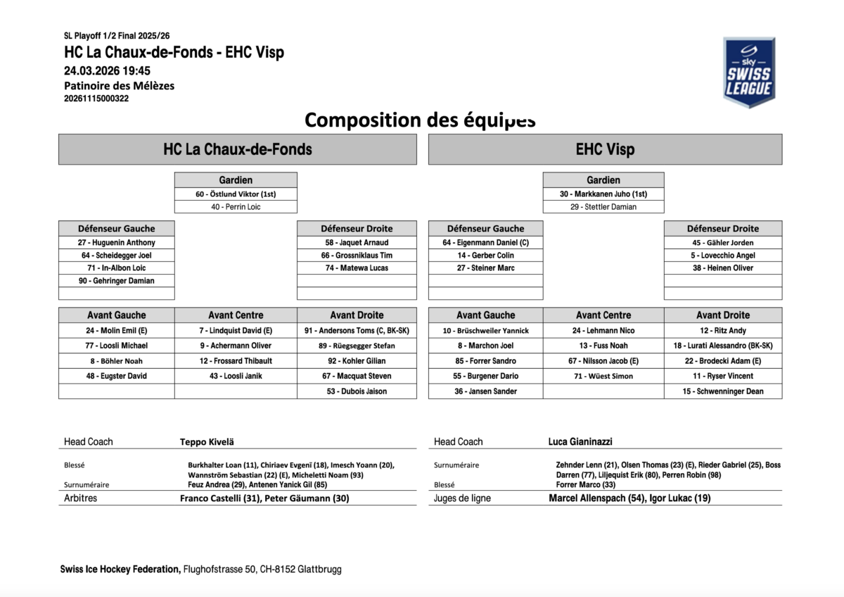 Aux Mélèzes, la soirée avait tout d’un quitte ou double. Et La Chaux-de-Fonds n’a pas tremblé. Dans un duel étouffant jusqu’à la sirène, les hommes de Teppo Kivelä ont renversé Viège (3-2) et poussent la série à un acte final irrespirable vendredi en Valais. Dès l’entame, le ton est donné: engagement total, rythme élevé, et deux équipes qui se rendent coup pour coup. Viège frappe le premier grâce à Adam Brodecki, opportuniste dans le slot. Mais la réaction ne se fait pas attendre: à peine le temps de respirer que Janik Loosli profite d’une erreur adverse pour égaliser dans la foulée. Tout est à refaire, et le public comprend rapidement qu’il va vivre une longue soirée.