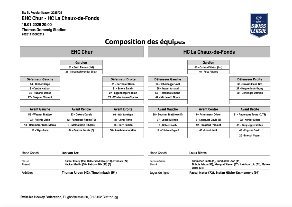 HC La Chaux-de-Fonds : Östlund (Feuz); Scheidegger, Grossniklaus; Jaquet, Huguenin; Terraneo, Gehringer; Micheletti; Boucher, Achermann, Andersons; M. Loosli, Lindquist, Kohler; Böhler, Frossard, Rüegsegger; Chiriaev, J. Loosli, Eugster; Imesch. Coach: Matte