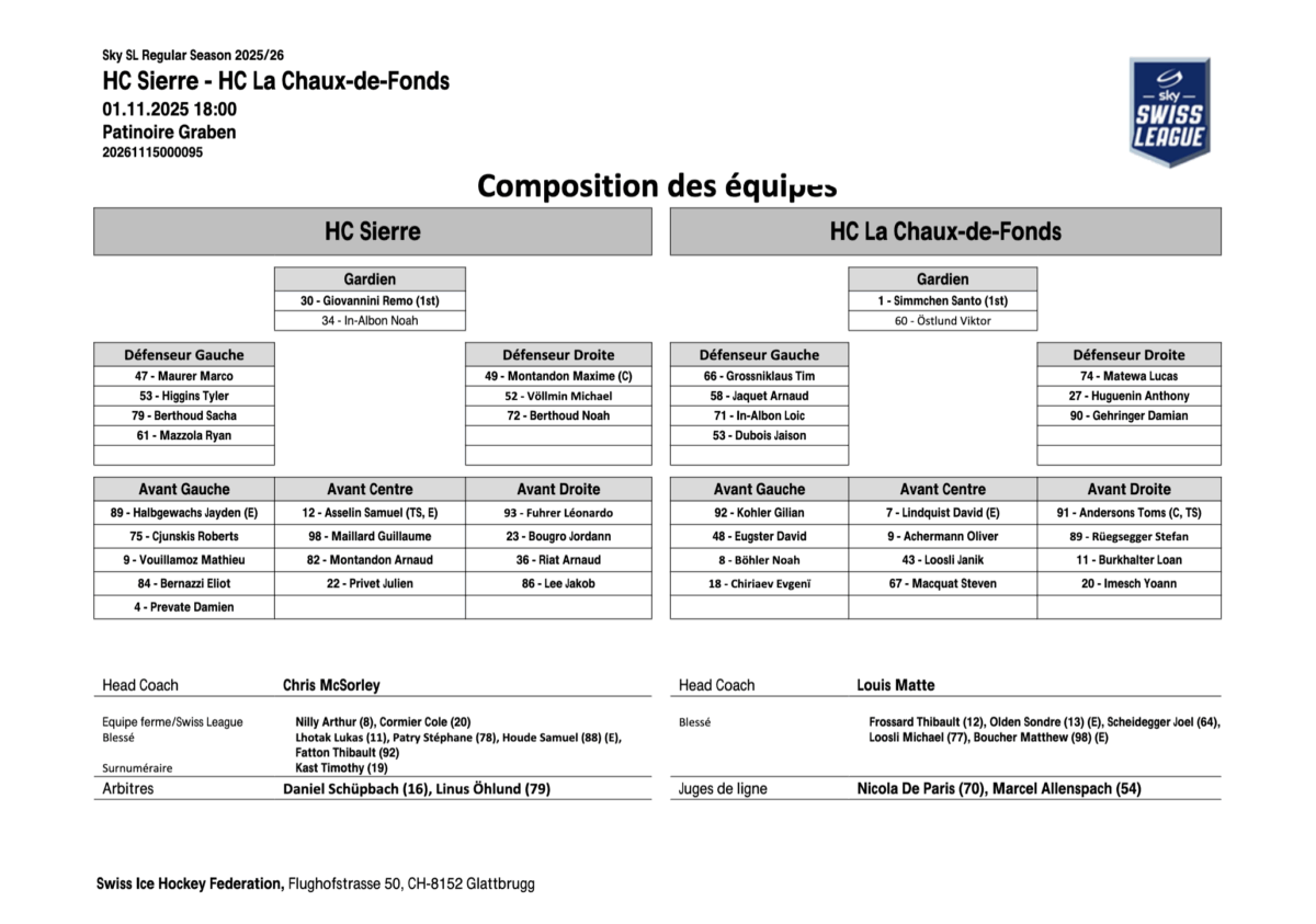 Le réalisme offensif de Sierre a fait la différence. Avec 37 tirs cadrés contre 29 et un taux d’engagements gagnés de 60 %, les Valaisans ont dominé toutes les zones de la glace. Fuhrer (3 buts) et Asselin (2 buts, 1 passe) ont été les moteurs d’un collectif tranchant, bien épaulés par Marco Maurer (4 passes). En face, les Abeilles ont payé leurs 14 minutes de pénalité et une efficacité en infériorité limitée à 80 %. Sierre s’est montré plus discipliné (8 PIM), plus constant et plus précis, avec deux buts inscrits en infériorité numérique. Les 45 mises en jeu remportées sur 75 illustrent leur contrôle du rythme. Une démonstration d’efficacité et de rigueur pour une équipe qui confirme sa solidité avant la trêve.