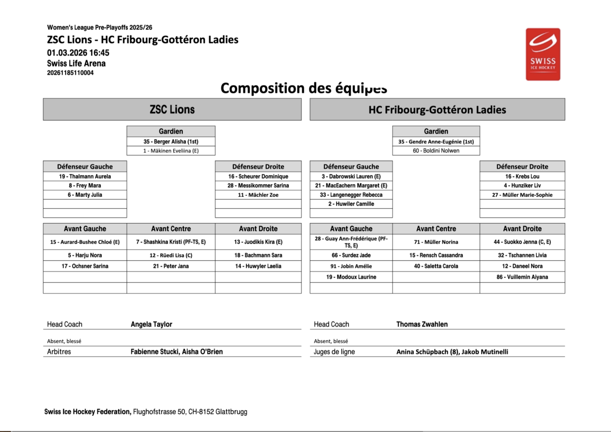 Corrigées 1-5 à domicile lors de l’acte I, les Fribourgeoises ont totalement inversé la tendance sur la glace des ZSC Lions. Succès 0-1 à Oerlikon et série de pré-play-off relancée. Tout se jouera mercredi à Guin (19h45). Dans l’antre zurichoise, les joueuses de Thomas Zwahlen ont livré un match discipliné, compact. Pas besoin de festival offensif: une seule réussite a suffi. À la 36e minute, Norina Müller a exploité un bon travail de ses coéquipières pour faire trembler les filets. Un beau blanchissage aussi pour la gardienne Anne-Eugénie Gendre qui a stoppé toues les tentaives zurichoises. Un petit bémol toutefois: le 0/3 en supériorité numérique.